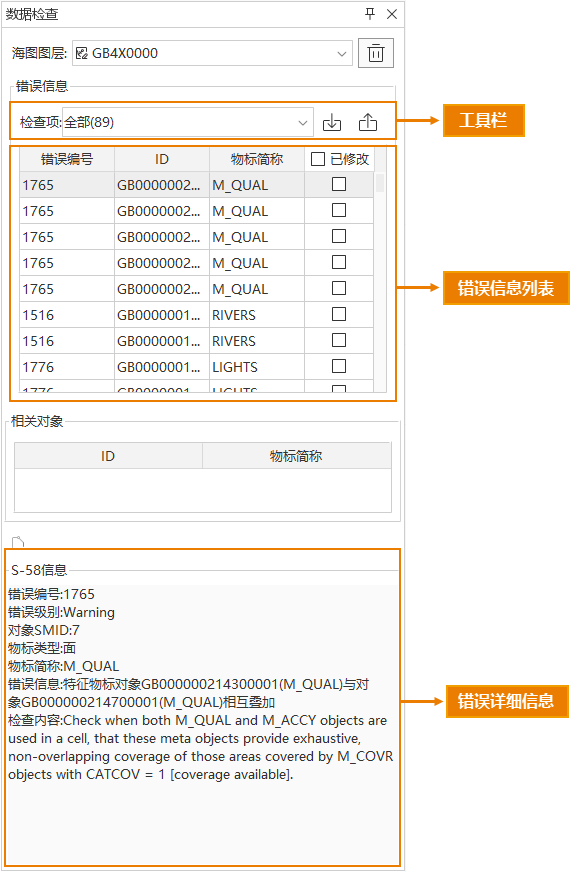 - 错误信息:在该示例中,检查项显示总共检查出 89 个错误,您可根据类型筛选错误信息列表的显示内容,便于后续修改。错误列表包含错误编号、ID、物标简称、修改状态记录框。选中错误信息时,对应的物标会在地图窗口中高亮并居中显示。