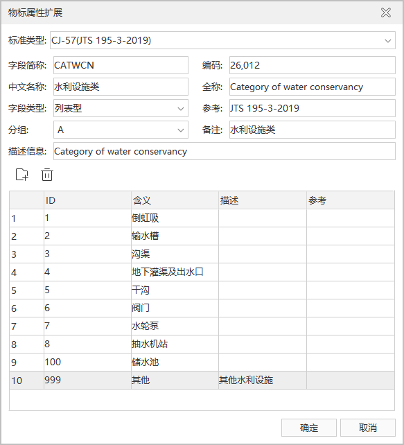 扩展 CJ-57 标准中的“水利设施”物标(详见物标扩展)时,发现该物标的属性字段中包括一个目前系统中缺少的属性字段“水利设施类 CATWCN”。因此,我们需要新增该属性字段。