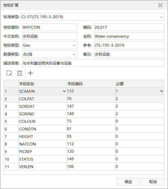 - 您需要手动设置字段的约束性:0(可选)、1(必填)、2(条件)。对应 CJ-57 对水利设施物标的属性表规定,M(必备属性)为 1,C(条件必备属性)为 2,O(可选属性)为 0。