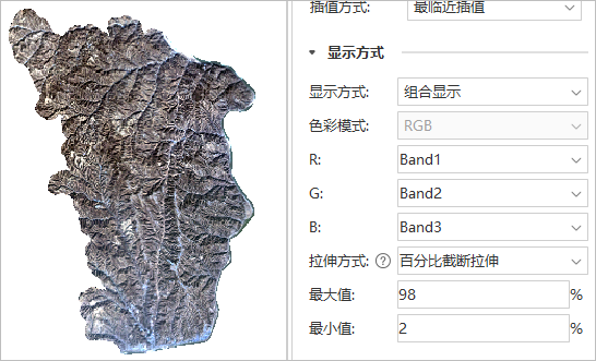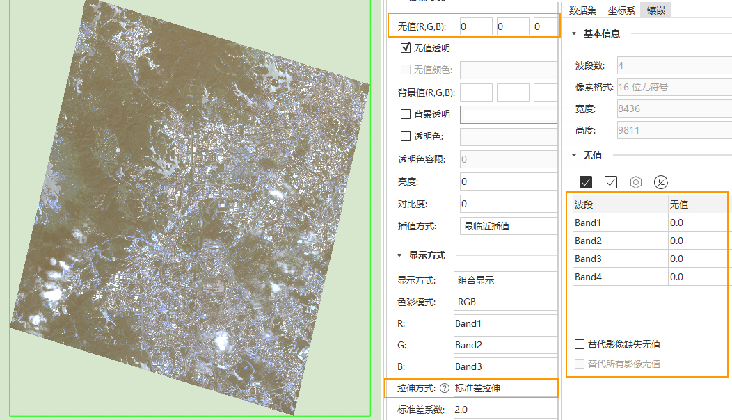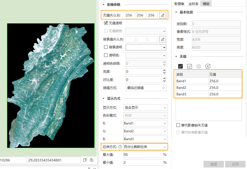 - 也可以重新打开镶嵌数据,调整拉伸方式,可正确显示影像,无值区域默认透明显示