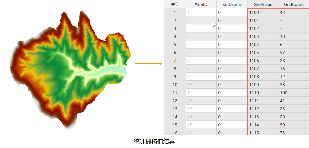 统计栅格值命令,用于统计栅格数据集的栅格值。便于用户查看栅格值的具体单值分布情况。