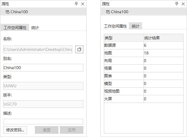 - 统计:显示当前工作空间中数据源、地图和布局等的统计信息。