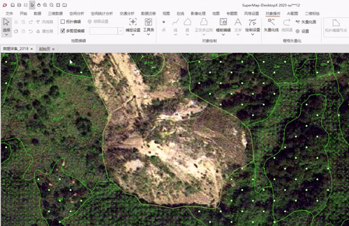 - 在图层管理器中启用相关图层的编辑状态,接着在数据编辑 选项卡 ->对象编辑组->拓扑编辑下拉菜单中开启拓扑编辑开关。开启后,地图中将叠加显示拓扑图。