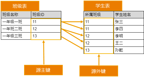 如下图,在班级表和学生表中,一个班级可以由多名学生组成,但一个学生只能在一个班级中。