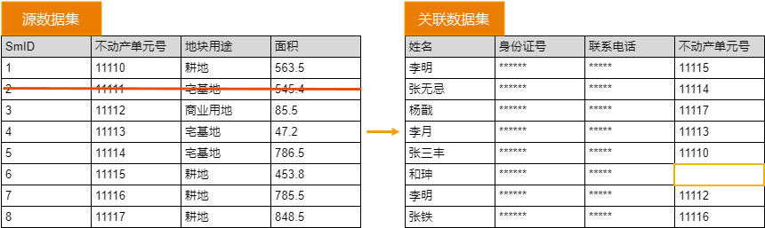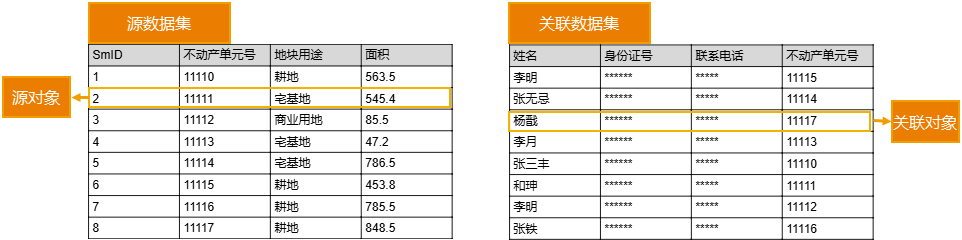 如下图,删除源数据集中不动产单元号为“11111”的对象,关联数据集中的不动产单元号值为“11111”的单元格将被清空。
