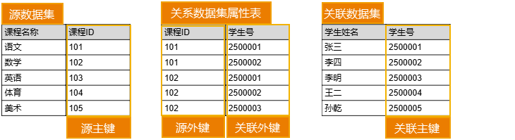 而在非关系属性化的关系数据集中,源数据集的源主键与源外键(源外键在关联数据集中)直接进行关联,无需通过关系数据集的属性信息进行维护。这种方式通常适用于一对一或一对多关系模型,即一个表中的某条记录可以关联另一个表中的一条或多条记录,但不支持从关联表反向追溯至源表。