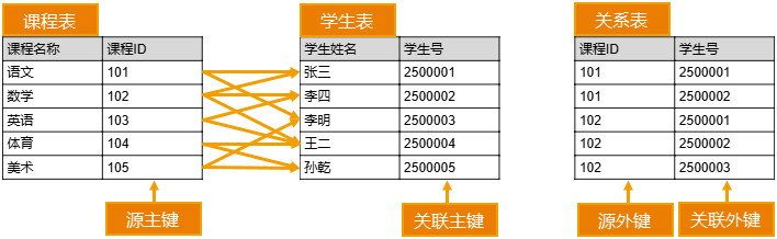 如下图的课程表和学生表中,一门课程可由多名学生选修,一名学生也可选修多门课程。由于无法在任意一张表中直接通过外键实现这种关联,通常需要引入一个关联表,用于存储课程表和学生表的主键作为外键。该关联表建立了课程与学生之间的映射关系,从而实现了两者之间的多对多关联。