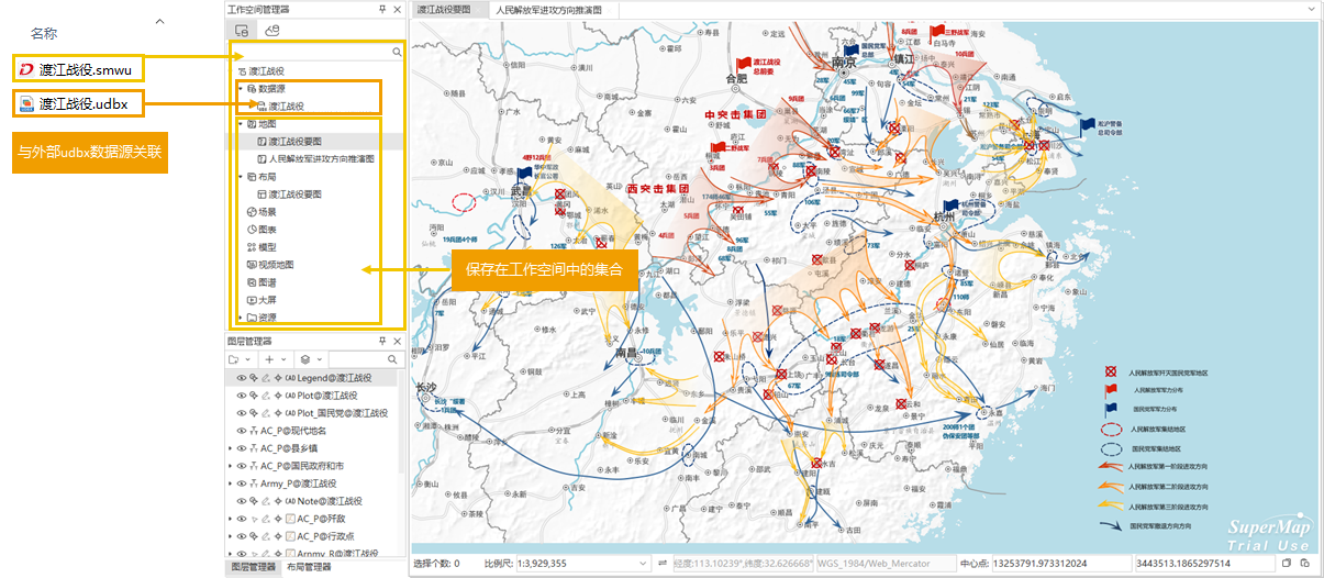 以示例数据SampleData_chs中的工作空间(渡江战役.smwu)为例:工作空间中的数据源是与外部*.udbx(渡江战役.udbx)数据源的关联文件;地图、布局、场景、图表、模型、视频地图、图谱、大屏以及资源则保存在工作空间中。如下图所示:
