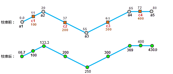 - 依次类推,使用c2和c3来校准a3,使用c3和c4来校准a4和a5。注意,校准率总是采样离被校准点最近的两个参考点来计算。