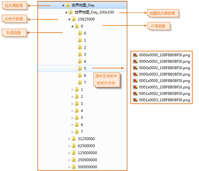 - 第三层:不同比例尺级别瓦片目录。分层目录名称为设置的比例尺大小。如15625000文件夹下保存的是比例尺为15625000时的地图瓦片文件。