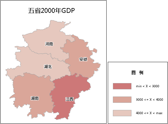 点击“专题图”选项卡中的“分段专题图”按钮,直接生成系统默认的分段专题图,用户可以在此基础上修改参数设置,制作符合制图需要的分段专题图。下图所示为分段专题图的示意图。利用河南(5137)、湖北(3028)、湖南(4276)、江西(2003)和安徽(3691)五省2000年 GDP 数值制作的分段专题图。按照 GDP 数值的分布情况,分为三段,最小值~3000,3000~4000,4000~最大值。每一段用不同的颜色表示。