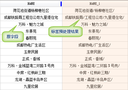 在制作标签专题图时,设置自动换行之后常常会出现换行文本显示不合理、不美观的现象, 提供的“标签预处理”功能可根据相关的分割原则,在指定的文本字段信息中添加分隔符,用预处理的结果字段来制作标签专题图。