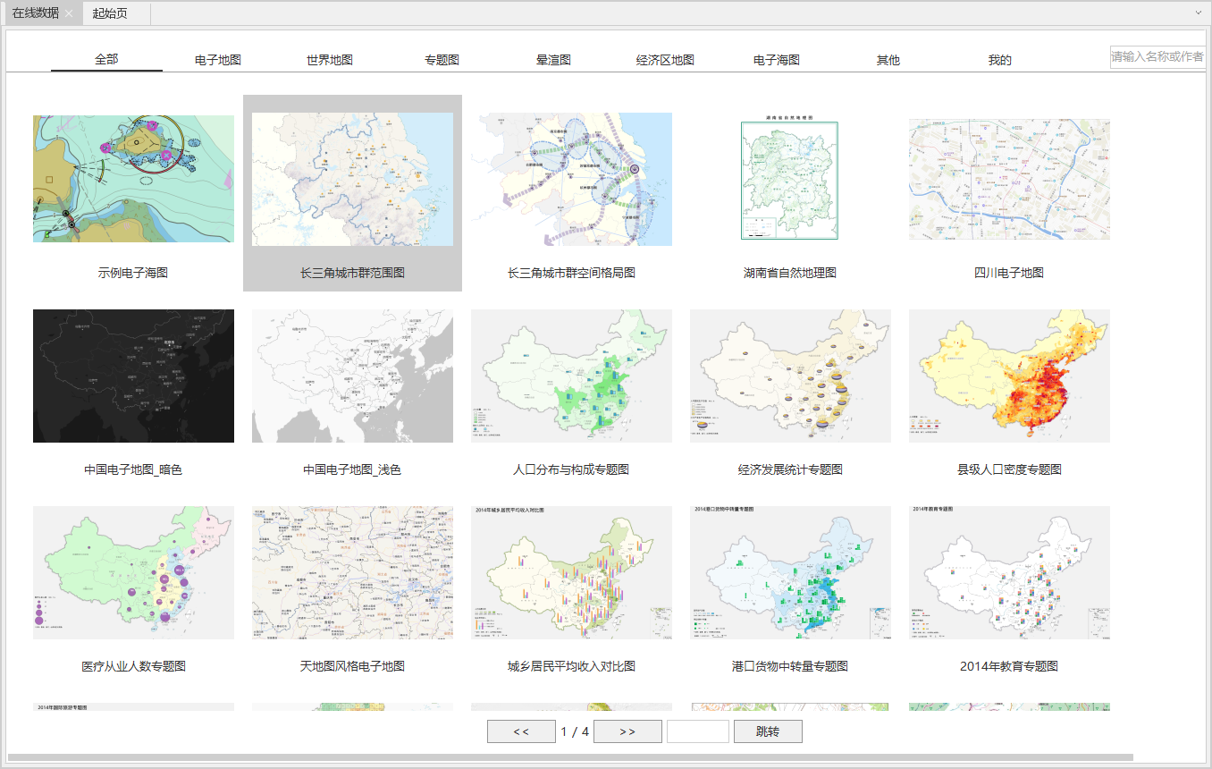 在工作空间管理器的云数据面板中单击在线地图树结点,即可在右侧面板中查看服务地址中的在线地图,在线地图按种类分为电子地图、世界地图、专题图、晕渲图、经济区地图、电子海图等,可根据地图类型进行查看。