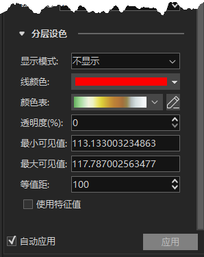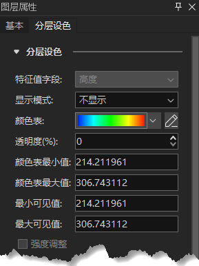 - 最小可见值:设置参与分层设色表达的模型高程/点云特征值的最小值,默认为模型高程/点云特征值的最小值。小于该值的数据将不显示分层设色。