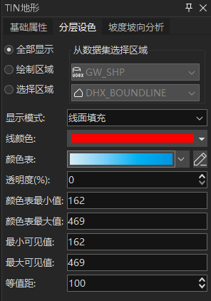 - 显示区域:在点云瓦片、倾斜摄影模型与TIN地形设置分层设色时,可自定义区域。