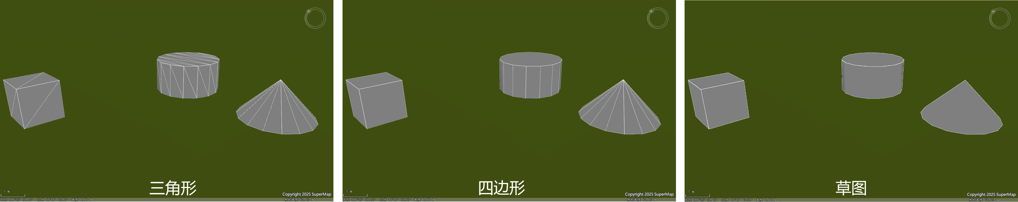 目前,支持以三角形、四边形模式显示模型数据集,以三角形、四边形或草图模式显示模型瓦片。