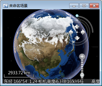 下图为执行全球操作的效果图,注意场景窗口中的导航罗盘的变化。(导航罗盘用来控制场景中地球所呈现的视角状态,以及放大缩小场景等操作。)