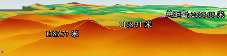 “依地距离”:在场景中的地形之上进行距离量算,该功能可以根据地形自动附着在地表之上计算出地表起伏的曲面距离。