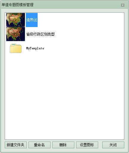 - 在该对话框中,可通过相关的操作,对专题图模板以及保存模板文件的文件夹进行统一管理。