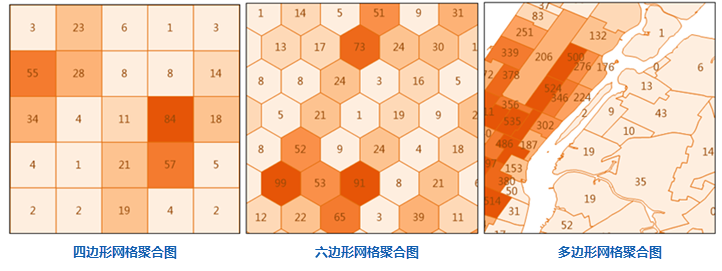 点聚合分析类型包括:网格面聚合、多边形聚合,其中网格面聚合图按照网格类型又可分为:四边形网格、六边形网格。