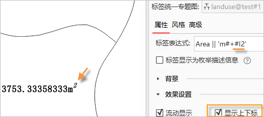 启用显示上下后,标签表达式可用 #I 标记使后续文本斜体,结合上下标标记可实现上下标文本独立斜体效果。如图:面对象标签取面积字段Area,添加单位平方米并将上标文字设为斜体,表达式为 Area || 'm#+#I2'
