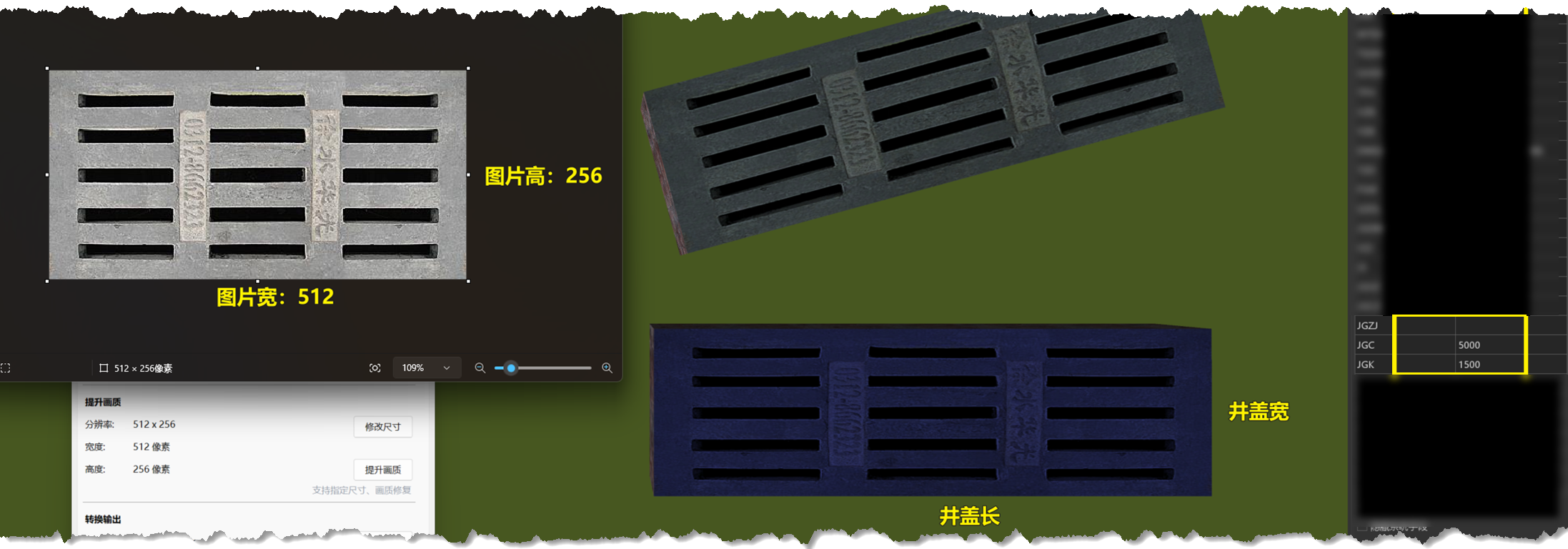 井盖材质图片的宽度和高度与井盖长度和井盖宽度参数的对应关系如下图所示。