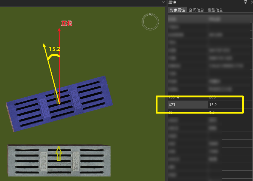 - 旋转角(有条件必备):当井盖形状为矩形时,需要设置井盖的旋转角度(以井盖中心为旋转点,以正北方向为0度基准方向,绕逆时针旋转),单位为度。通过选择点数据集中的属性字段来设置,字段类型为双精度。