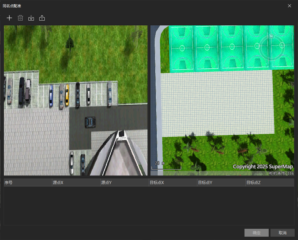 - 单击导入按钮,可以将记录了参与配准的源点坐标和目标点坐标的同名配准文件(*.xml)导入到面板中,或者单击同名点配准面板上的添加按钮,依次在左右两边窗口中添加参与配准的源点和目标点(需要在视频投放区域内)。如下图左边窗口展示的是视频内容,右边窗口展示的是场景内容。