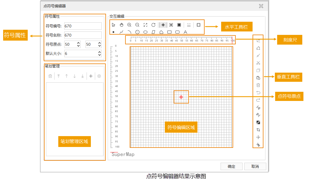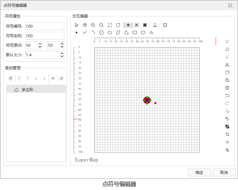 - 符号编辑:符号编辑区域是绘制点符号的绘图区域,构成点符号的几何对象都在符号编辑区域进行绘制,符号编辑区域提供了刻度尺以及背景格网,方便符号的精确绘制。