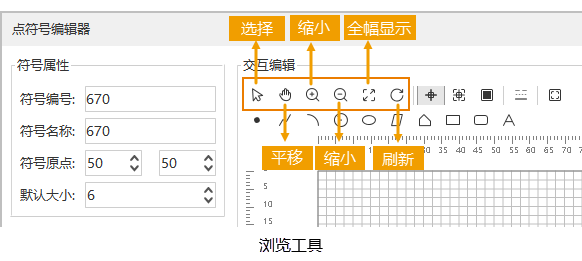 在点符号编辑器中,如下所示的工具栏上的按钮,为用来在符号编辑区域进行浏览的工具,下面具体介绍各个按钮的使用。下文介绍了点符号选择器中浏览功能的使用,关于点符号选择器的其他功能的使用,将在帮助文档中的其他页面进行详细介绍,您可以查阅帮助文档的其他部分。