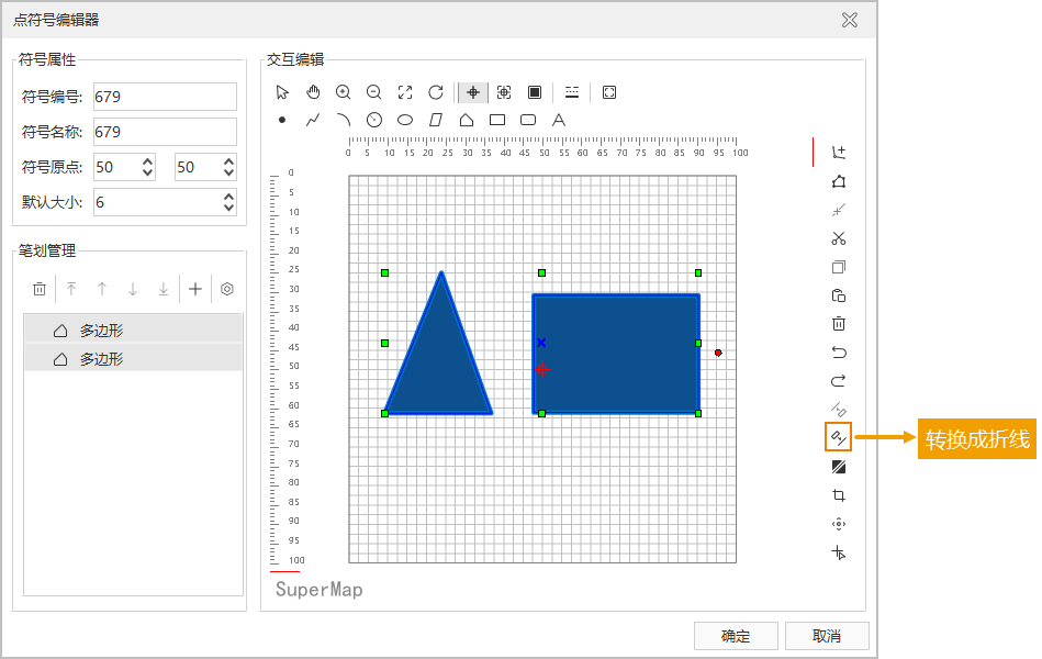 - 单击工具栏上的转换成折线按钮,即可将面类型笔划转换为线类型笔划,转换获得的线类型笔划为面对象的边界线,一个面类型笔划对应转换后的一个线类型笔划。