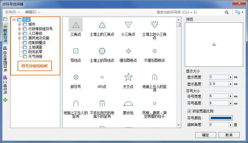 下面将介绍如何通过界面交互操作,实现符号库分组结构的管理。以下操作以点符号库为例,介绍如何在符号选择器中进行符号分组的管理,对于线型符号库和填充符号库,可以采用相同的方式,在相应的符号管理器中完成符号库分组结构的管理。