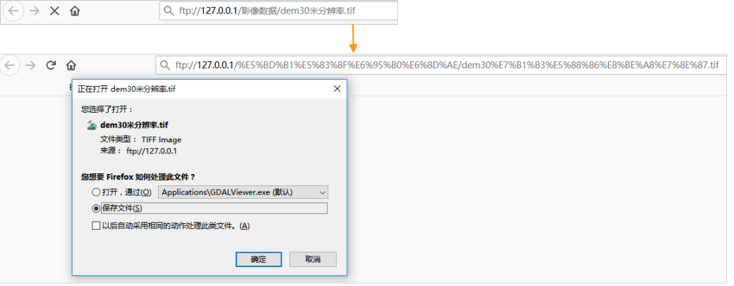 镶嵌数据集支持管理来自 FTP 服务器的影像文件,若影像文件的 FTP 路径中包含非英文字符,添加到镶嵌数据集时可能失败。原因是 FTP 客户端的编码与服务器所使用的编码不一致,FTP 服务器路径经过转码后导致路径错误,无法访问到影像文件。因此,当遇到这种情况时,需要获得包含非英文字符的 FTP 服务器路径的真实下载路径。例如:FTP 服务器路径为:ftp://127.0.0.1/影像数据/dem30米分辨率.tif,它对应的真实下载路径为:ftp://127.0.0.1/%E5%BD%B1%E5%83%8F%E6%95%B0%E6%8D%AE/dem30%E7%B1%B3%E5%88%86%E8%BE%A8%E7%8E%87.tif。 如何获得 FTP 服务器路径的真实下载路径: