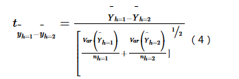 式中: Yh表示子区域h内的属性均值,如发病率或流行率;nh为子区域h内样本数量,Var表示方差。统计量t近似地服从Student's t分布,其中自由度的计算方法为:
