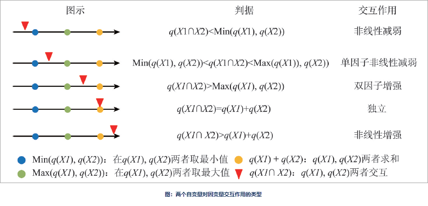 识别不同风险因子Xs之间的交互作用,即评估因子X1和X2共同作用时是否会增加或减弱对因变量Y的解释力,或这些因子对Y的影响是相互独立的。评估的方法是首先分别计算两种因子X1和X2对Y的q值:q(X1)和q(X2),并且计算它们交互(叠加变量X1和X2两个图层相切所形成的新的多边形分布)时的q值: q(X1∩X2),并对 q(X1)、 q(X2)与 q(X1∩X2)进行比较。两个因子之间的关系可分为以下几类: