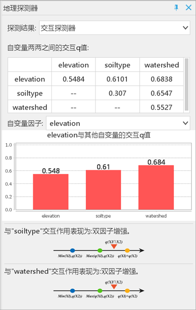 所有探测器结果将生成新的属性表数据集存储至数据源中,同时在右侧地理探测器面板中输出分析结果,下面将对各探测器结果进行分析: