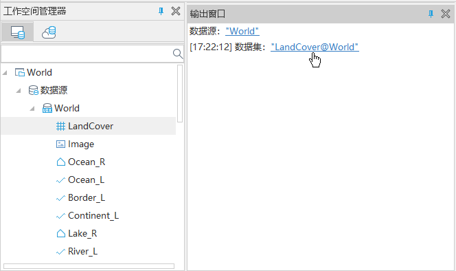 输出窗口的显示效果如下,单击数据源/数据集,可直接在工作空间管理器中定位到指定的数据源/数据集