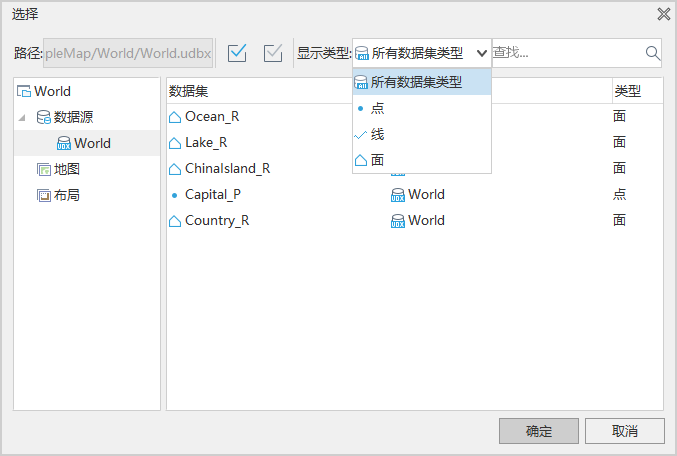 //选择面板支持的类型,包括数据集、地图、布局、模型、统计图表