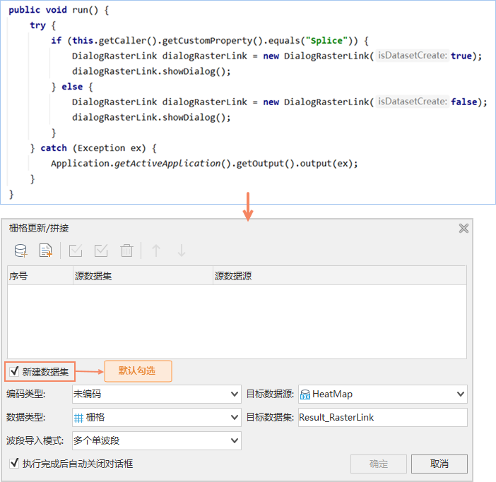 - customProperty:用户可设置代码中定义的相关属性值,例如“拼接”功能按钮,其自定义属性值设置为:Splice,代码中定义了Splice的实现后,则栅格更新/拼接对话框默认勾选“新建数据集”复选框。