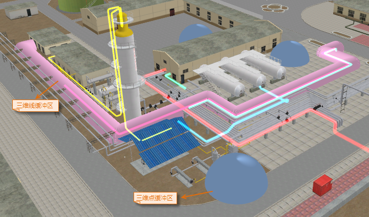 三维缓冲区分析是在三维场景中,围绕指定点/线/面/体对象,创建指定距离的三维区域的分析方法。生成结果是三维面或三维体模型,用于表示对象的影响范围、安全区域或临近区等。