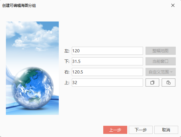 创建可编辑海图分组:第2步 - 完成第二步的范围设置后,单击下一步按钮,在弹出的对话框中,设置下列参数: