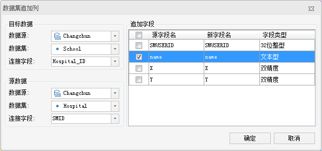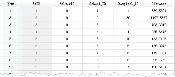 - 得到结果为属性表数据,记录了学校ID、与其最近的医院ID及距离信息。通过“追加列”功能,将结果属性表中的 Hospital_ID 和 Distance 字段信息追加到学校的点数据集中。