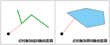 - 计算两个对象间距离时,出现包含或(部分)重叠的情况时,距离均为 0。例如点对象在线对象上,二者间距离为 0。