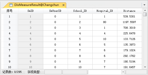 - 设置好以上参数后,点击“运行”按钮,即可执行距离计算操作,下图为计算最近距离的结果数据: