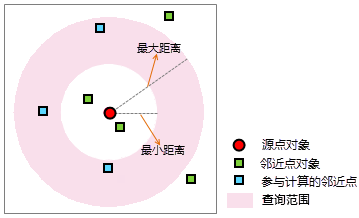 - 范围内距离:即从源数据集中的每一个点对象出发,计算每个邻近对象与源对象之间的距离,并根据设置的查询范围,返回距离在最大最小范围内的所有对象ID和距离值。选择“范围内距离”计算方式后,需设置最小、最大距离值,单位与数据集单位一致。