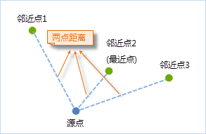 两点之间的距离即为两点之间的连线距离,若计算最近距离,则会计算分别源点到临近点的距离,将最近的一个或多个等距离的临近点输出为结果。
