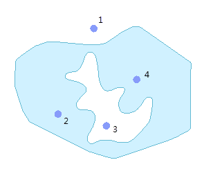面对象是由一系列线段围绕而成的一个封闭的区域,因此,计算点到面的距离首先要确定与点距离最近的线段,再使用上图3所示方法计算出点到线的距离,即点到面对象的距离。若点不在面对象范围内,则距离值为正;若点包含在面对象中,则距离为零。如下图所示:点2和点4到面的距离为零,点1和点3到面的距离为正值。