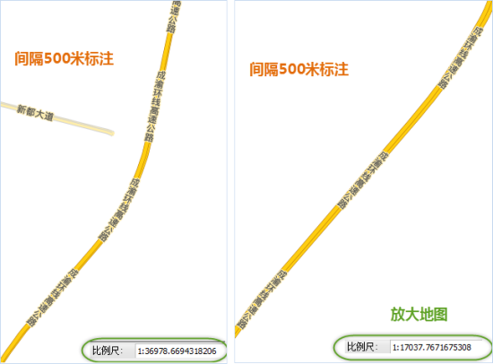 图:文本避让的缓存范围后的标签 - 控制道路沿线注记频率