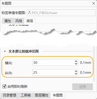 图:使用文本换行后效果 SuperMap 软件支持的调整标签密度的有效手段是设置“文本避让的缓存范围”,就是通过指定一个水平和垂直距离,如下图所示,由这两个值限定的矩形范围不允许其他标签压盖此范围,从而达到标签抽稀显示的效果。