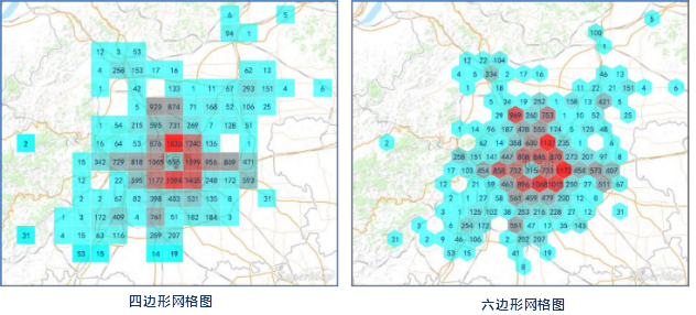 网格聚合图是使用空间聚合方法,表现空间数据的分布特征和统计特征。SuperMap提供了两种形状的网格进行聚合显示,一种是矩形网格,一种是六边形网格。